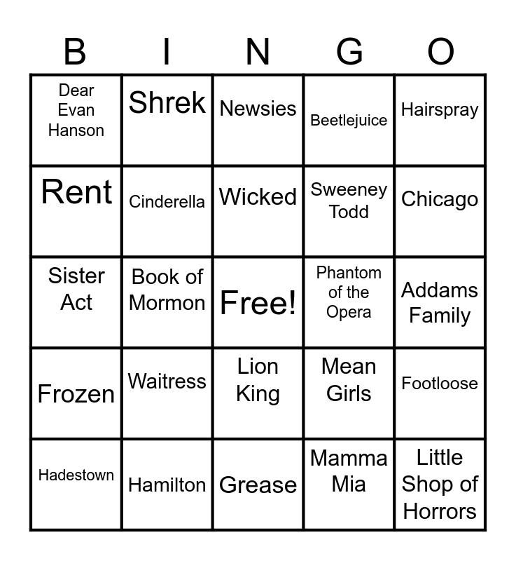 This bingo card has a free space and 24 words: Waitress, Hamilton, Wicked, Hadestown, Hairspray, Dear Evan Hanson, Rent, Shrek, Phantom of the Opera, Lion King, Sweeney Todd, Sister Act, Mean Girls, Footloose, Cinderella, Mamma Mia, Addams Family, Newsies, Chicago, Book of Mormon, Little Shop of Horrors, Frozen, Beetlejuice and Grease.