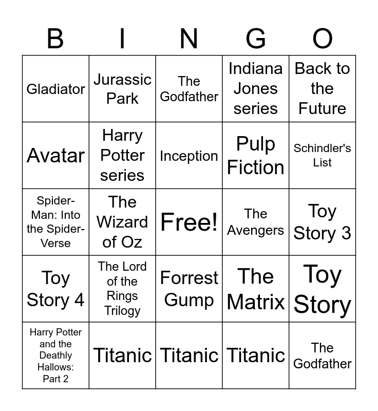 This bingo card has a free space and 50 words: The Shawshank Redemption, The Godfather, Forrest Gump, Titanic, The Lord of the Rings Trilogy, Star Wars (Original Trilogy), Jurassic Park, The Lion King, Avatar, The Dark Knight, Harry Potter series, Indiana Jones series, Toy Story, The Matrix, Forrest Gump, Jurassic Park, Inception, The Avengers, E.T. the Extra-Terrestrial, Back to the Future, The Wizard of Oz, Titanic, Gladiator, Pulp Fiction, The Silence of the Lambs, The Shawshank Redemption, Schindler's List, Fight Club, The Godfather, Forrest Gump, The Dark Knight, The Lord of the Rings: The Return of the King, The Matrix, Star Wars: Episode IV - A New Hope, Titanic, Avatar, The Lion King, Finding Nemo, The Lord of the Rings: The Fellowship of the Ring, Toy Story 3, Harry Potter and the Sorcerer's Stone, Pirates of the Caribbean: The Curse of the Black Pearl, The Lord of the Rings: The Two Towers, Shrek, Harry Potter and the Deathly Hallows: Part 2, Spider-Man: Into the Spider-Verse, The Incredibles, The Dark Knight Rises, Toy Story 4 and Joker.