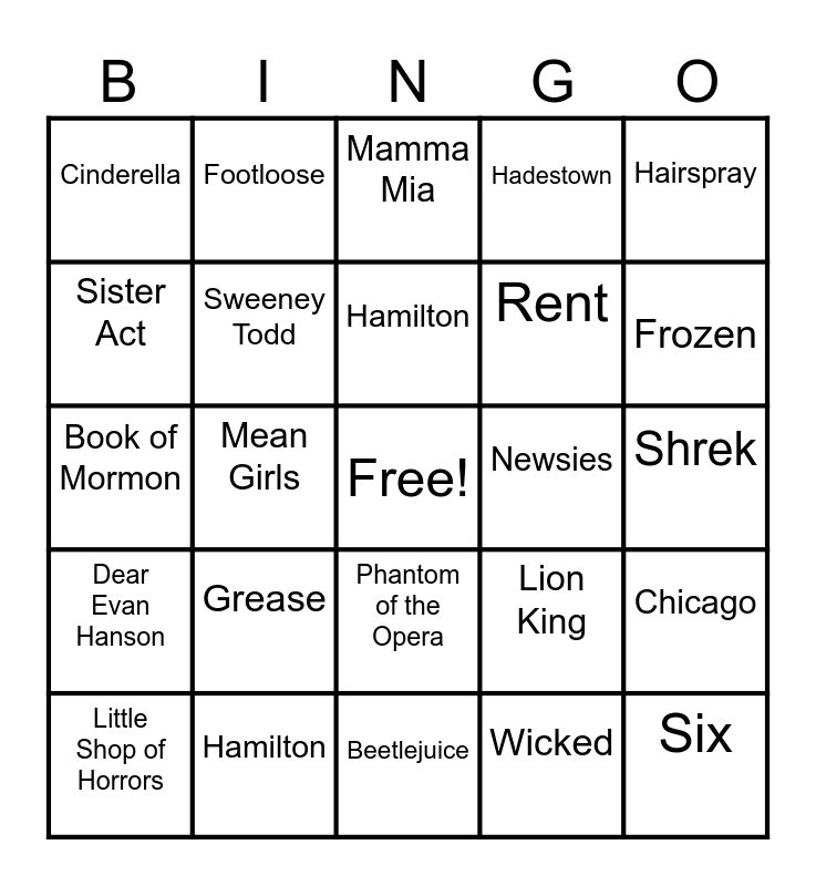 This bingo card has a free space and 24 words: Grease, Hamilton, Hamilton, Little Shop of Horrors, Hairspray, Cinderella, Sister Act, Footloose, Newsies, Phantom of the Opera, Rent, Book of Mormon, Lion King, Chicago, Sweeney Todd, Wicked, Shrek, Mamma Mia, Frozen, Mean Girls, Six, Dear Evan Hanson, Hadestown and Beetlejuice.