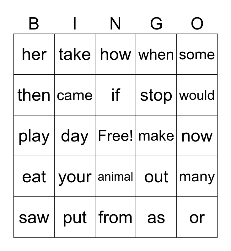 This bingo card has a free space and 24 words: your, put, if, saw, some, her, then, take, make, animal, stop, play, out, many, came, as, now, how, would, day, or, eat, when and from.