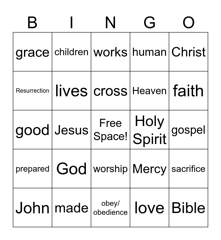 This bingo card has a free space and 29 words: John, death, Jesus, redeem/ redemption, grace, works, lives, God, Holy Spirit, made, gospel, Bible, obey/ obedience, love, faith, commandment, worship, prepared, Christ, good, Mercy, Raised, Heaven, Resurrection, human, children, sacrifice, cross and Gospel.