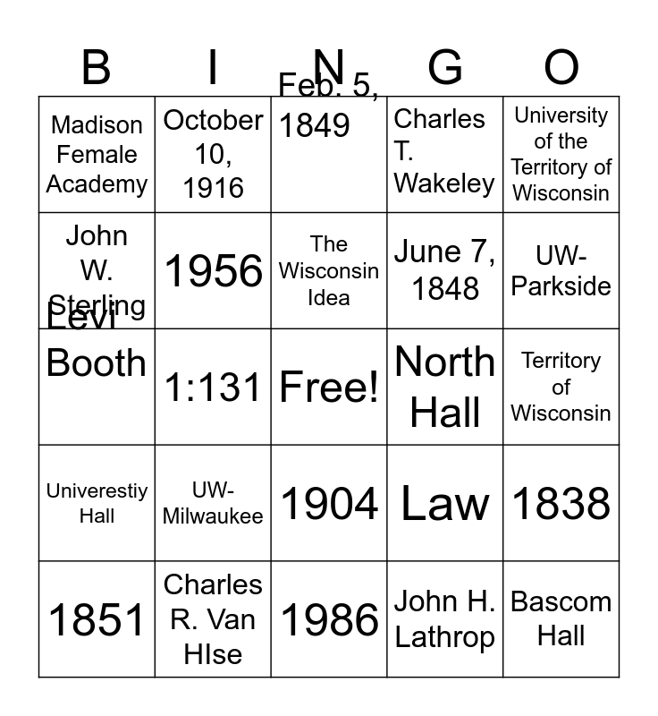 This bingo card has a free space and 28 words: 1838, Nelson Dewey, June 7, 1848, John H. Lathrop, John W. Sterling, Feb. 5, 1849, October 10, 1916, Univerestiy Hall, North Hall, 1851, Levi Booth, Charles T. Wakeley, Charles R. Van HIse, 1986, UW- Parkside, UW- Green Bay, UW- Milwaukee, 1956, The Wisconsin Idea, 1904, Madison Female Academy, 17, Bascom Hall, 1:131, Territory of Wisconsin, Law, University of the Territory of Wisconsin and 1848.