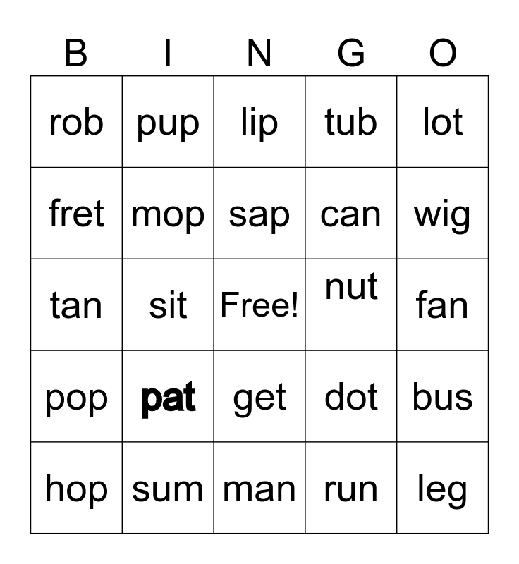This bingo card has a free space and 24 words: pat, sum, sap, hop, lot, rob, fret, pup, nut, get, can, tan, dot, bus, mop, run, fan, lip, wig, sit, leg, pop, tub and man.