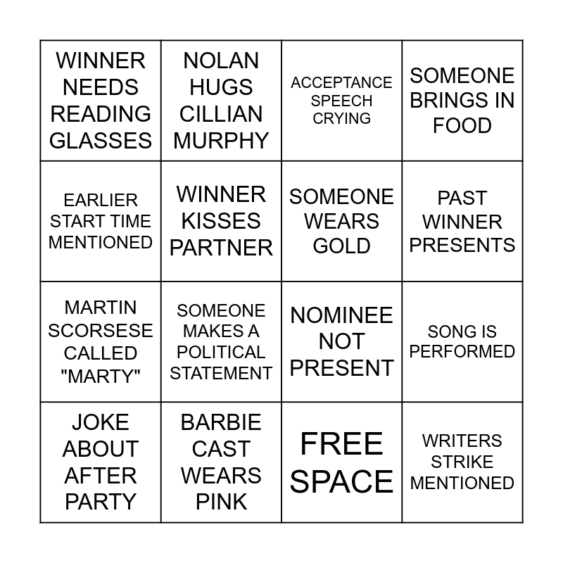 This bingo card has 16 words: BARBIE CAST WEARS PINK, SONG IS PERFORMED, ACCEPTANCE SPEECH CRYING, WINNER NEEDS READING GLASSES, MARTIN SCORSESE CALLED "MARTY", NOLAN HUGS CILLIAN MURPHY, NOMINEE NOT PRESENT, FREE SPACE, EARLIER START TIME MENTIONED, WINNER KISSES PARTNER, JOKE ABOUT AFTER PARTY, SOMEONE BRINGS IN FOOD, SOMEONE MAKES A POLITICAL STATEMENT, PAST WINNER PRESENTS, SOMEONE WEARS GOLD and WRITERS STRIKE MENTIONED.
