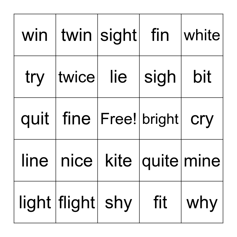 This bingo card has a free space and 29 words: light, night, fine, thin, win, sight, twice, nice, bright, flight, cry, why, shy, fit, bit, bite, kite, line, white, quit, quite, high, sigh, try, fin, twin, mine, lie and fly.