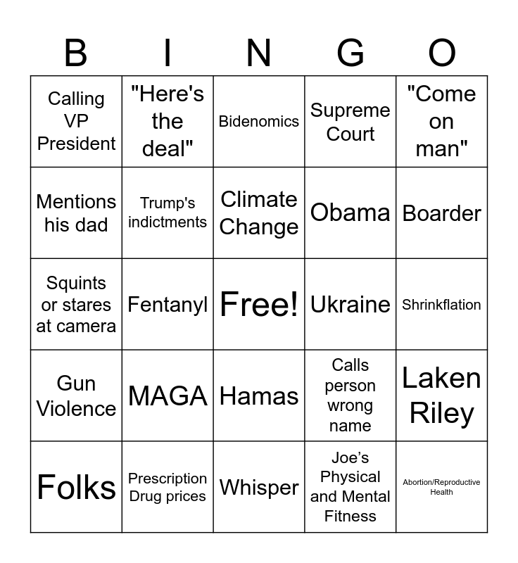 This bingo card has a free space and 25 words: MAGA, Whisper, Climate Change, Folks, "Come on man", Calling VP President, Mentions his dad, "Here's the deal", Ukraine, Hamas, Obama, Squints or stares at camera, Calls person wrong name, Laken Riley, Trump's indictments, Infastructure, Shrinkflation, Bidenomics, Boarder, Fentanyl, Abortion/Reproductive Health, Prescription Drug prices, Gun Violence, Supreme Court and Joe’s Physical and Mental Fitness.
