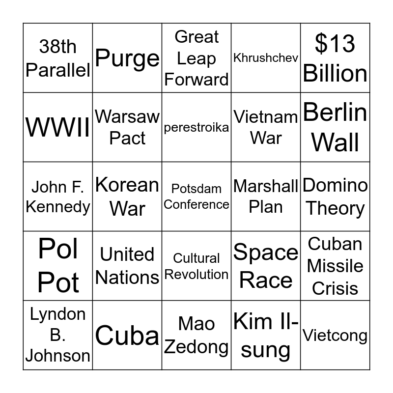This bingo card has 50 words: Yalta Conference, Potsdam Conference, Constitutional Monarchy, Mao Zedong, United Nations, Stalin, Purge, Collectivization, WWII, Satellite Nation, Warsaw Pact, Khrushchev, Cuban Missile Crisis, Space Race, Gorbachev, glasnost, perestroika, Marshall Plan, Truman Doctrine, $13 Billion, Korean War, Kim Il-sung, 38th Parallel, Vietnam War, Ho Chi Minh, Vietcong, Berlin Wall, embargo, Great Leap Forward, Cultural Revolution, communism, capitalism, totalitarian, democracy, Cuba, USSR, NATO, containment, SEATO, Domino Theory, Iron Curtain, Winston Churchill, Richard Nixon, Ronald Reagan, Lyndon B. Johnson, John F. Kennedy, Dwight D. Eisenhower, Khmer Rouge, Pol Pot and Lech Walesa.