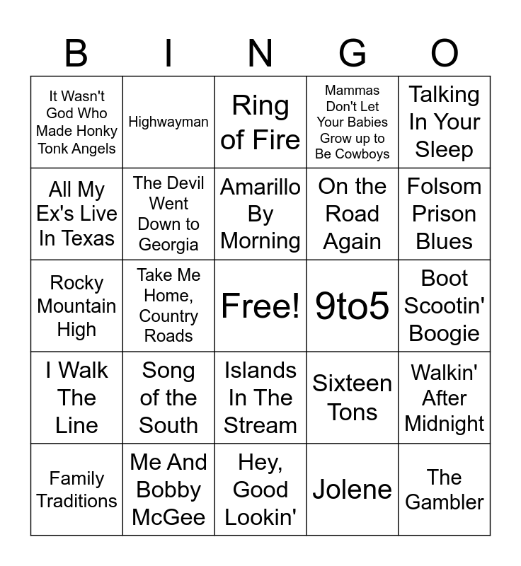 This bingo card has a free space and 24 words: Song of the South, Me And Bobby McGee, Amarillo By Morning, Family Traditions, Talking In Your Sleep, It Wasn't God Who Made Honky Tonk Angels, All My Ex's Live In Texas, Highwayman, 9to5, Islands In The Stream, On the Road Again, Rocky Mountain High, Sixteen Tons, Walkin' After Midnight, The Devil Went Down to Georgia, Jolene, Boot Scootin' Boogie, Ring of Fire, Folsom Prison Blues, Take Me Home, Country Roads, The Gambler, I Walk The Line, Mammas Don't Let Your Babies Grow up to Be Cowboys and Hey, Good Lookin'.