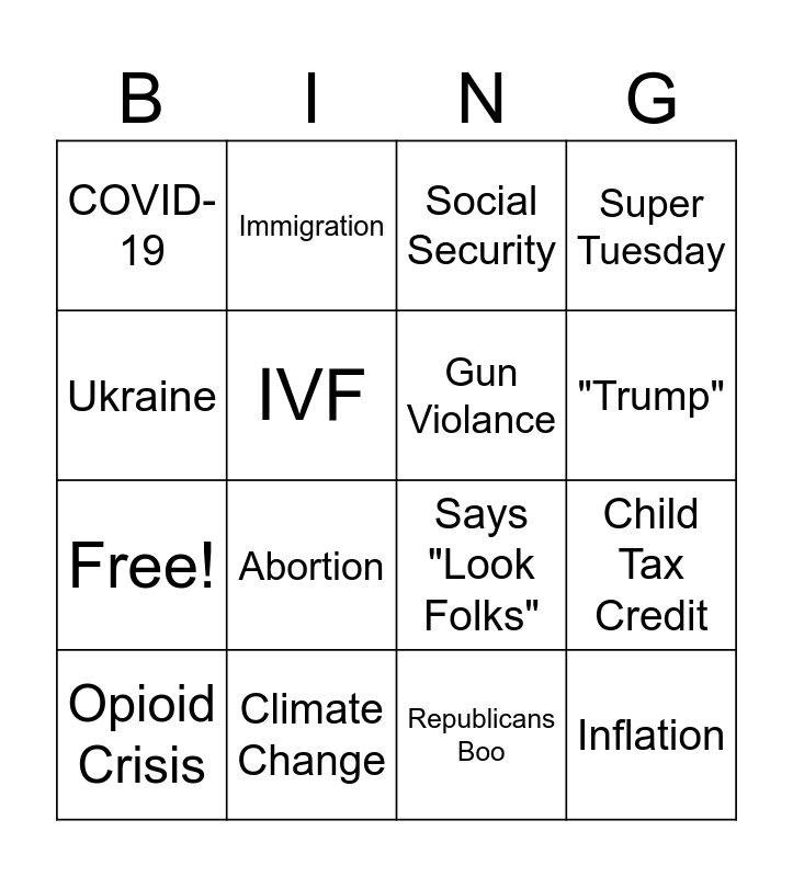 This bingo card has 20 words: Child Tax Credit, Ukraine, Social Security, Unions, Opioid Crisis, Ukraine, Climate Change, COVID-19, Free!, Immigration, Abortion, Says "Look Folks", IVF, Inflation, Gun Violance, Student Loans, "Trump", Super Tuesday, Republicans Boo and Gas Prices.