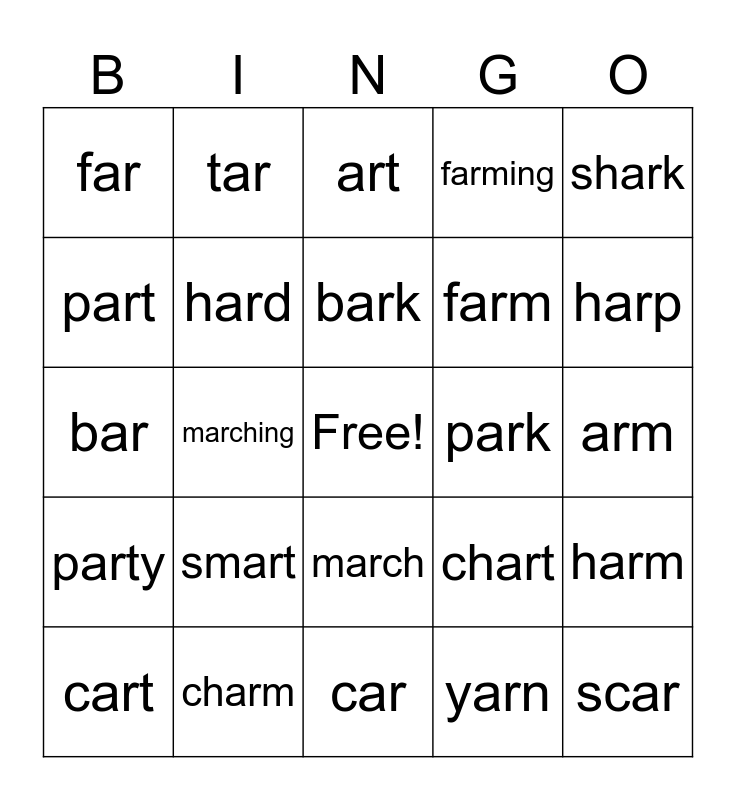 This bingo card has a free space and 36 words: start, large, dark, hard, chart, party, bark, yard, shark, charging, marching, farming, barking, park, harp, far, sharp, smart, scar, art, arm, harm, charm, cart, car, tar, bar, barn, farm, part, card, charge, yarn, march, scarf and apart.