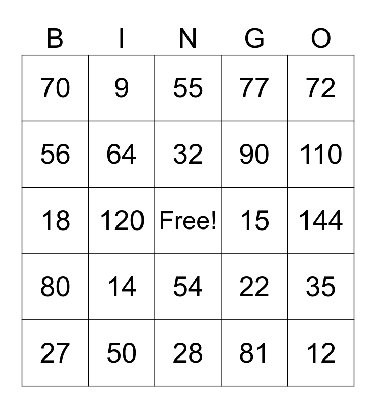 This bingo card has a free space and 49 words: 84, 12, 96, 28, 14, 8, 9, 121, 56, 48, 64, 77, 35, 22, 44, 49, 32, 15, 42, 72, 120, 81, 70, 90, 63, 110, 27, 21, 54, 80, 30, 33, 36, 45, 50, 16, 66, 25, 144, 10, 60, 24, 88, 132, 18, 55, 20, 40 and 99.