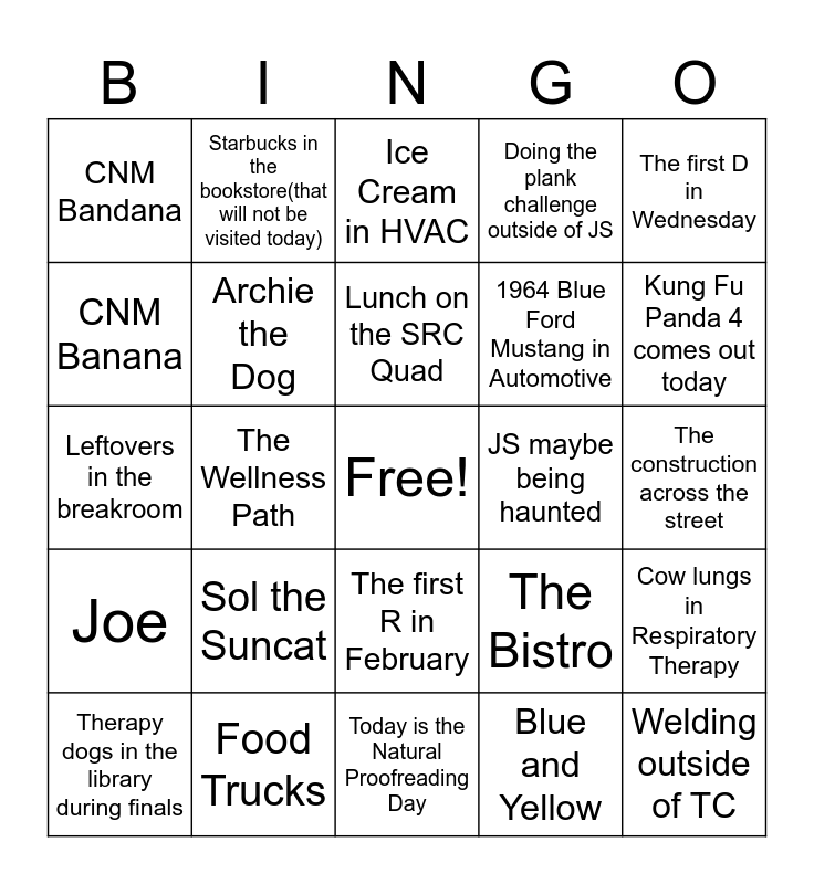 This bingo card has a free space and 27 words: The Bistro, The Food Pantry, 1964 Blue Ford Mustang in Automotive, Today is the Natural Proofreading Day, CNM Banana, Ice Cream in HVAC, Starbucks in the bookstore(that will not be visited today), Joe, JS maybe being haunted, Cow lungs in Respiratory Therapy, Leftovers in the breakroom, Doing the plank challenge outside of JS, Therapy dogs in the library during finals, Food Trucks, Kung Fu Panda 4 comes out today, Walking Shoes, Archie the Dog, Lunch on the SRC Quad, Sol the Suncat, CNM Bandana, The construction across the street, Blue and Yellow, The Wellness Path, Welding outside of TC, The first R in February, The first D in Wednesday and Student Loans.
