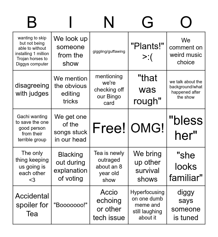 This bingo card has a free space and 24 words: Blacking out during explanation of voting, "Booooooo!", mentioning we're checking off our Bingo card, Accidental spoiler for Tea, We comment on weird music choice, wanting to skip but not being able to without installing 1 million Trojan horses to Diggys computer, disagreeing with judges, We look up someone from the show, OMG!, Tea is newly outraged about an 8 year old show, "that was rough", Gachi wanting to save the one good person from their terrible group, We bring up other survival shows, "she looks familiar", We mention the obvious editing tricks, Hyperfocusing on one dumb meme and still laughing about it, "bless her", giggling/guffawing, we talk about the background/what happened after the show, We get one of the songs stuck in our head, diggy says someone is tuned, The only thing keeping us going is each other <3, "Plants!" >:( and Accio echoing or other tech issue.