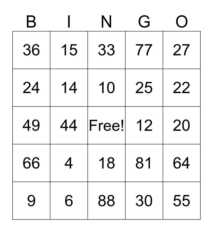 This bingo card has a free space and 24 words: 4, 6, 10, 9, 27, 36, 24, 15, 12, 18, 25, 49, 81, 64, 14, 30, 20, 33, 22, 44, 55, 66, 77 and 88.