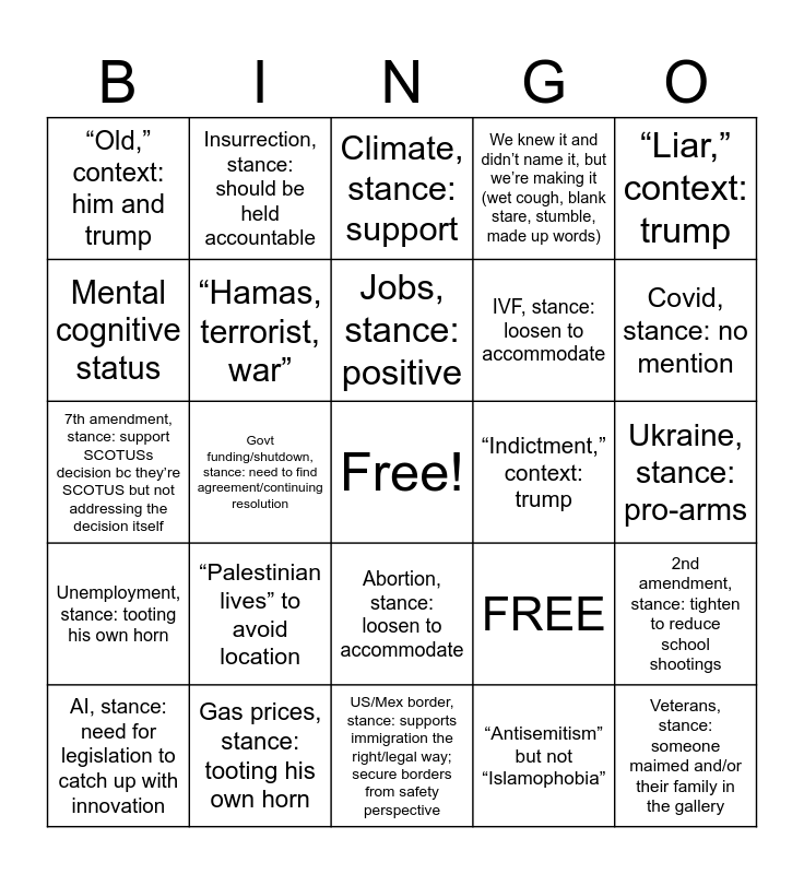 This bingo card has a free space and 25 words: “Palestinian lives” to avoid location, US/Mex border, stance: supports immigration the right/legal way; secure borders from safety perspective, Jobs, stance: positive, AI, stance: need for legislation to catch up with innovation, “Liar,” context: trump, “Old,” context: him and trump, Mental cognitive status, Insurrection, stance: should be held accountable, “Indictment,” context: trump, Abortion, stance: loosen to accommodate, IVF, stance: loosen to accommodate, 7th amendment, stance: support SCOTUSs decision bc they’re SCOTUS but not addressing the decision itself, FREE, 2nd amendment, stance: tighten to reduce school shootings, “Hamas, terrorist, war”, China, stance: rising power, we’re still stronger, competition in EV, chips, science, Ukraine, stance: pro-arms, Climate, stance: support, Covid, stance: no mention, Govt funding/shutdown, stance: need to find agreement/continuing resolution, Veterans, stance: someone maimed and/or their family in the gallery, Gas prices, stance: tooting his own horn, Unemployment, stance: tooting his own horn, We knew it and didn’t name it, but we’re making it (wet cough, blank stare, stumble, made up words) and “Antisemitism” but not “Islamophobia”.