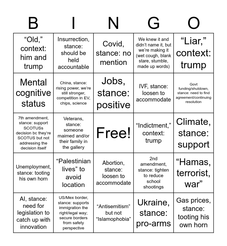 This bingo card has a free space and 24 words: “Palestinian lives” to avoid location, US/Mex border, stance: supports immigration the right/legal way; secure borders from safety perspective, Jobs, stance: positive, AI, stance: need for legislation to catch up with innovation, “Liar,” context: trump, “Old,” context: him and trump, Mental cognitive status, Insurrection, stance: should be held accountable, “Indictment,” context: trump, Abortion, stance: loosen to accommodate, IVF, stance: loosen to accommodate, 7th amendment, stance: support SCOTUSs decision bc they’re SCOTUS but not addressing the decision itself, 2nd amendment, stance: tighten to reduce school shootings, “Hamas, terrorist, war”, China, stance: rising power, we’re still stronger, competition in EV, chips, science, Ukraine, stance: pro-arms, Climate, stance: support, Covid, stance: no mention, Govt funding/shutdown, stance: need to find agreement/continuing resolution, Veterans, stance: someone maimed and/or their family in the gallery, Gas prices, stance: tooting his own horn, Unemployment, stance: tooting his own horn, We knew it and didn’t name it, but we’re making it (wet cough, blank stare, stumble, made up words) and “Antisemitism” but not “Islamophobia”.