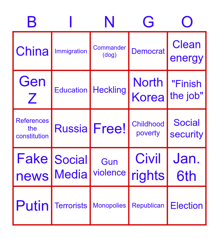 This bingo card has a free space and 67 words: Ukraine, Israel/ Gaza, Trump, Jan. 6th, "MAGA", Infrastructure, Immigration, Deficit, Heckling, Coughing fit, Gun violence, Biden stumbles/trips, Social security, Clean energy, Oil, Gen Z, Russia, China, Iran, North Korea, Social Media, Fake news, Democrat, Republican, Reproductive rights, Crime, Inflation, Student debt, "Finish the job", Taxes, Election, Covid-19, Biden mixes up his words, Medicare, Navalny, Putin, Founding fathers, Civil rights, References the constitution, Separation of powers, Judicial oversight, Education, Childhood poverty, Book bans, LGBTQ issues, Political polarization, Tariffs, Terrorists, Hunter Biden, Jill Biden, Commander (dog), Supreme court, Job growth, Supermarket issues, Economy, Monopolies, Shrinkflation, Junk fees, Drug prices, "My dad", Scranton PA, Unions, "Hard-working families", "Fellow Americans", Agriculture, Farmers and Protesters.