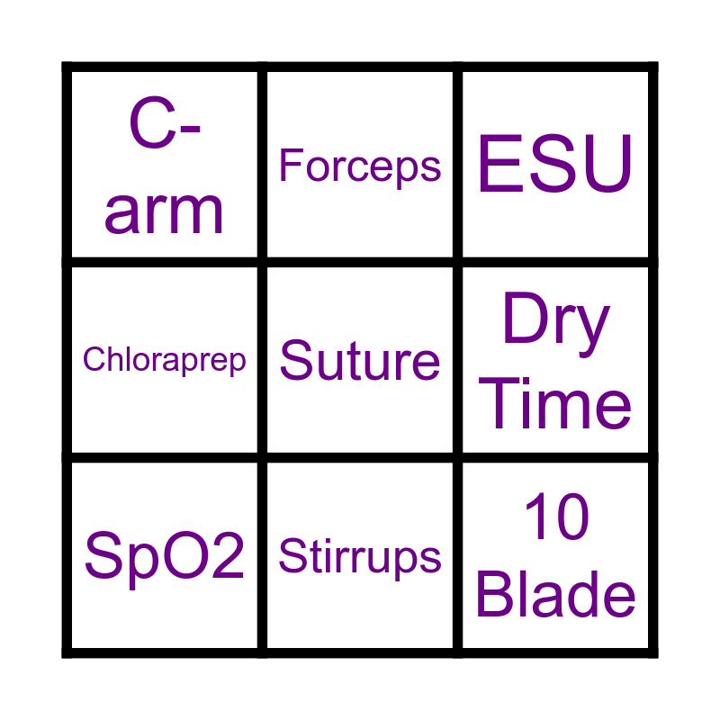 This bingo card has 16 words: Bupivacaine, SCD, ESU, C-arm, 10 Blade, Forceps, Anesthesia, Time Out, Suture, Dry Time, Bair Hugger, Chloraprep, Dermabond, Stirrups, SpO2 and Da Vinci.