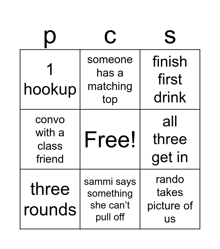 This bingo card has a free space and 8 words: all three get in, finish first drink, someone has a matching top, three rounds, 1 hookup, rando takes picture of us, convo with a class friend and sammi says something she can’t pull off.