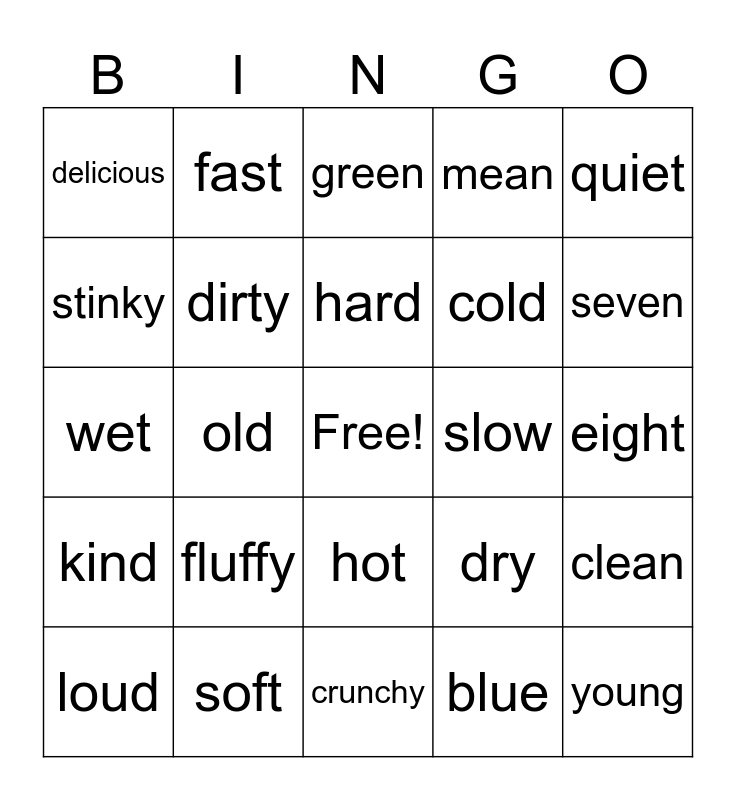 This bingo card has a free space and 24 words: fluffy, soft, hard, loud, quiet, delicious, stinky, fast, slow, hot, cold, wet, dry, clean, dirty, blue, eight, green, seven, old, young, kind, mean and crunchy.