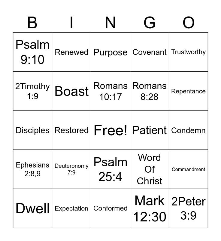 This bingo card has a free space and 36 words: Grace, Faith, Works, Boast, Word Of Christ, Ephesians 2:8,9, Romans 10:17, Forsaken, Trustworthy, Sin, Restored, Covenant, Faithful, Patient, Repentance, Psalm 9:10, Romans 8:38,39, Deuteronomy 7:9, 2Peter 3:9, Purpose, Condemn, Commandment, Expectation, Dwell, Conformed, Renewed, Disciples, Gospel, Romans 8:28, 2Timothy 1:9, John 3:17, 1John 4:9, Mark 12:30, Psalm 25:4, Romans 12:2 and Matthew 28:19,20.