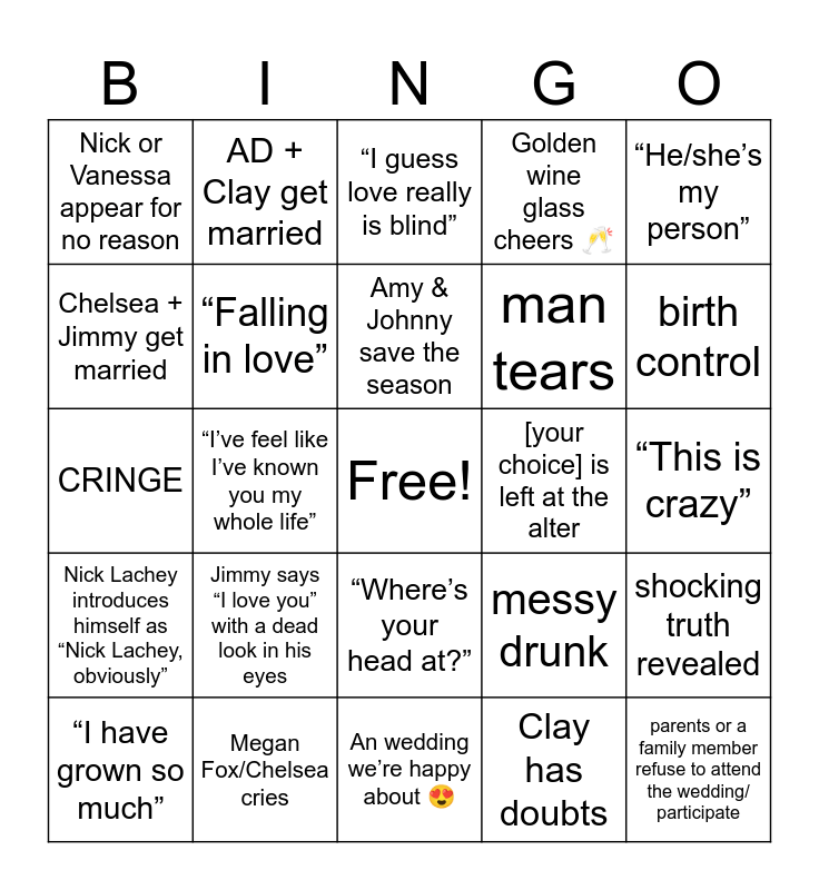 This bingo card has a free space and 24 words: Jimmy says “I love you” with a dead look in his eyes, Megan Fox/Chelsea cries, Amy & Johnny save the season, “I have grown so much”, “He/she’s my person”, Nick or Vanessa appear for no reason, Chelsea + Jimmy get married, AD + Clay get married, [your choice] is left at the alter, “Where’s your head at?”, man tears, CRINGE, messy drunk, shocking truth revealed, “Falling in love”, Clay has doubts, “This is crazy”, “I guess love really is blind”, birth control, “I’ve feel like I’ve known you my whole life”, parents or a family member refuse to attend the wedding/ participate, Nick Lachey introduces himself as “Nick Lachey, obviously”, Golden wine glass cheers 🥂 and An wedding we’re happy about 😍.