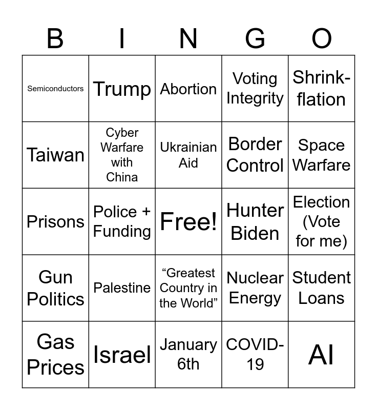 This bingo card has a free space and 24 words: Palestine, Israel, Ukrainian Aid, Gas Prices, Shrink-flation, Semiconductors, Taiwan, Trump, Hunter Biden, “Greatest Country in the World”, Border Control, Prisons, Nuclear Energy, Student Loans, Cyber Warfare with China, COVID-19, Election (Vote for me), Abortion, Space Warfare, Police + Funding, AI, Gun Politics, Voting Integrity and January 6th.