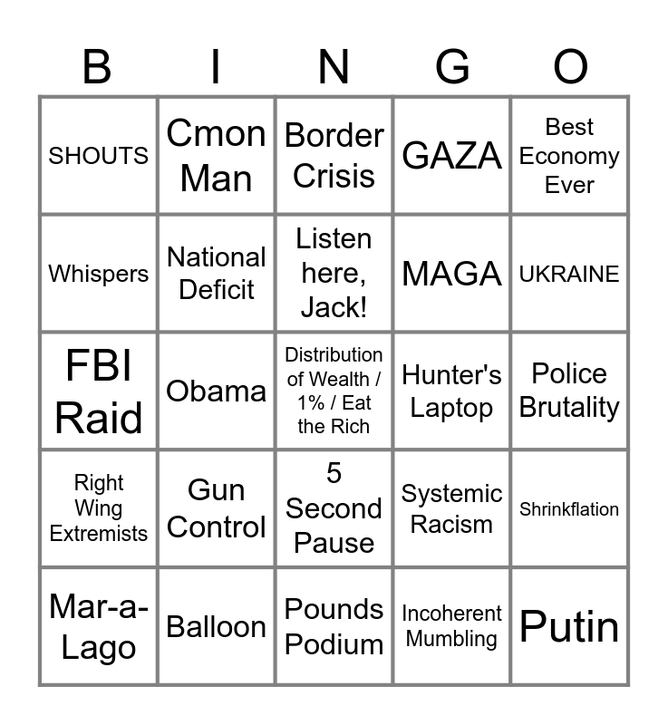 This bingo card has a free space and 32 words: Incoherent Mumbling, Verbal Gaffe, Obama, Trump, Right Wing Extremists, National Deficit, Best Economy Ever, Shrinkflation, Cmon Man, True Story, Listen here, Jack!, Border Crisis, Malarky, Threat to our Democracy, Hunter's Laptop, Bo Biden, Mar-a-Lago, FBI Raid, 5 Second Pause, Gun Control, Systemic Racism, Jan 6, Police Brutality, Balloon, Putin, GAZA, MAGA, Whispers, SHOUTS, Pounds Podium, Folks and UKRAINE.