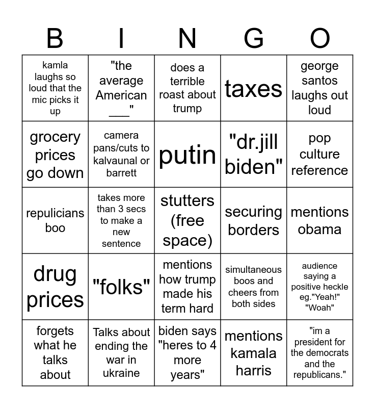 This bingo card has a free space and 24 words: "folks", Talks about ending the war in ukraine, putin, forgets what he talks about, george santos laughs out loud, kamla laughs so loud that the mic picks it up, grocery prices go down, "the average American ___", securing borders, mentions how trump made his term hard, "dr.jill biden", repulicians boo, simultaneous boos and cheers from both sides, audience saying a positive heckle eg."Yeah!" "Woah", camera pans/cuts to kalvaunal or barrett, mentions kamala harris, mentions obama, does a terrible roast about trump, pop culture reference, takes more than 3 secs to make a new sentence, "im a president for the democrats and the republicans.", drug prices, taxes and biden says "heres to 4 more years".