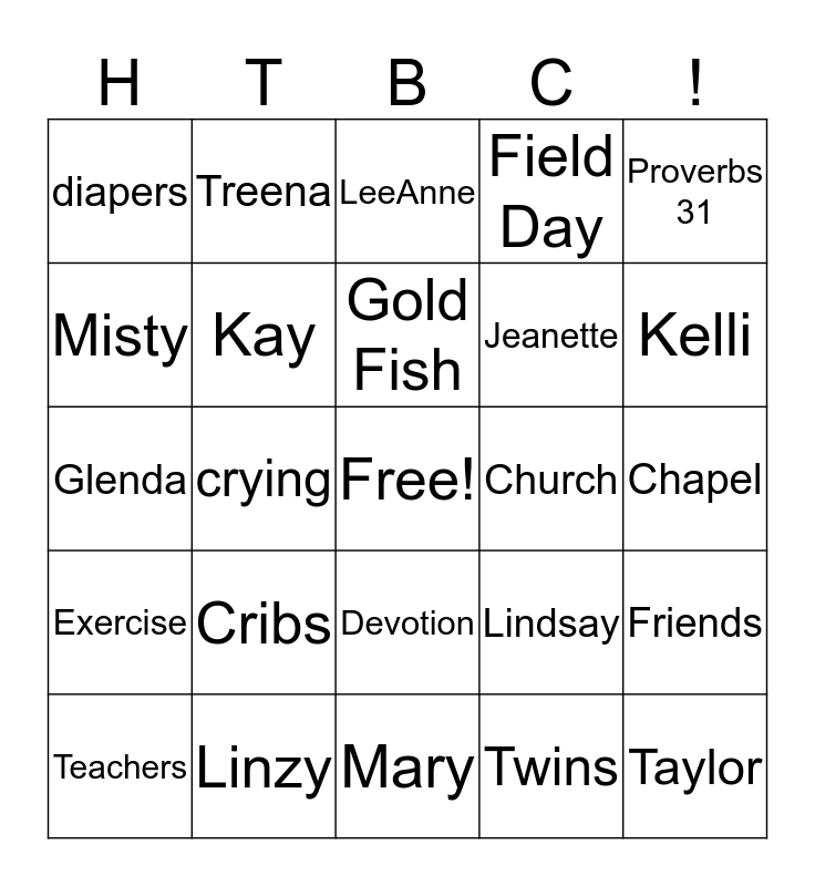 This bingo card has a free space and 24 words: Cribs, Linzy, Gold Fish, Teachers, Proverbs 31, diapers, Misty, Treena, Church, Devotion, Jeanette, Glenda, Lindsay, Friends, Kay, Twins, Chapel, LeeAnne, Kelli, crying, Taylor, Exercise, Field Day and Mary.