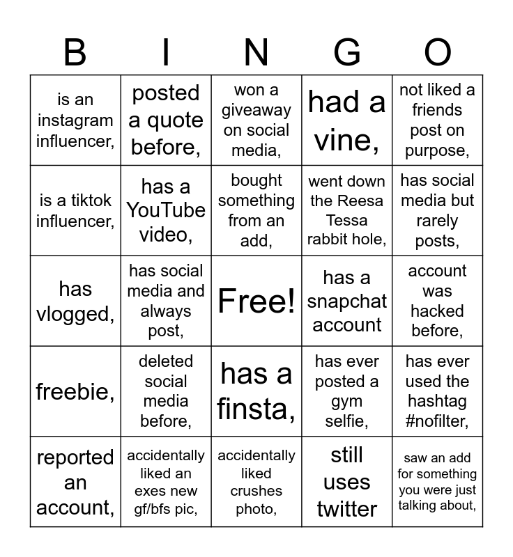 This bingo card has a free space and 25 words: deleted social media before,, accidentally liked crushes photo,, bought something from an add,, reported an account,, not liked a friends post on purpose,, is an instagram influencer,, is a tiktok influencer,, posted a quote before,, has a snapchat account, has a finsta,, went down the Reesa Tessa rabbit hole,, has vlogged,, has ever posted a gym selfie,, has ever used the hashtag #nofilter,, has a YouTube video,, hasn’t had social media in the past 5+ years,, account was hacked before,, won a giveaway on social media,, has social media but rarely posts,, has social media and always post,, saw an add for something you were just talking about,, accidentally liked an exes new gf/bfs pic,, freebie,, had a vine, and still uses twitter.