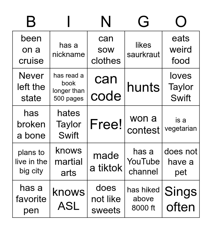 This bingo card has a free space and 24 words: knows martial arts, knows ASL, can code, has a favorite pen, eats weird food, been on a cruise, Never left the state, has a nickname, won a contest, made a tiktok, hunts, has broken a bone, has a YouTube channel, does not have a pet, has read a book longer than 500 pages, has hiked above 8000 ft, is a vegetarian, can sow clothes, loves Taylor Swift, hates Taylor Swift, Sings often, plans to live in the big city, likes saurkraut and does not like sweets.