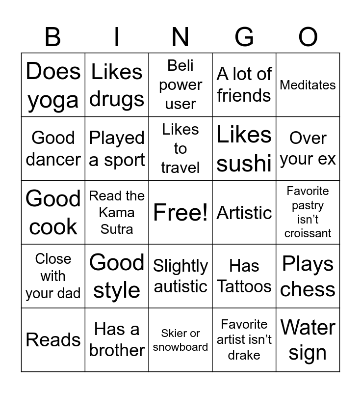 This bingo card has a free space and 24 words: Good style, Has a brother, Likes to travel, Reads, Meditates, Does yoga, Good dancer, Likes drugs, Artistic, Slightly autistic, Likes sushi, Good cook, Has Tattoos, Plays chess, Played a sport, Favorite artist isn’t drake, Favorite pastry isn’t croissant, Beli power user, Over your ex, Read the Kama Sutra, Water sign, Close with your dad, A lot of friends and Skier or snowboard.