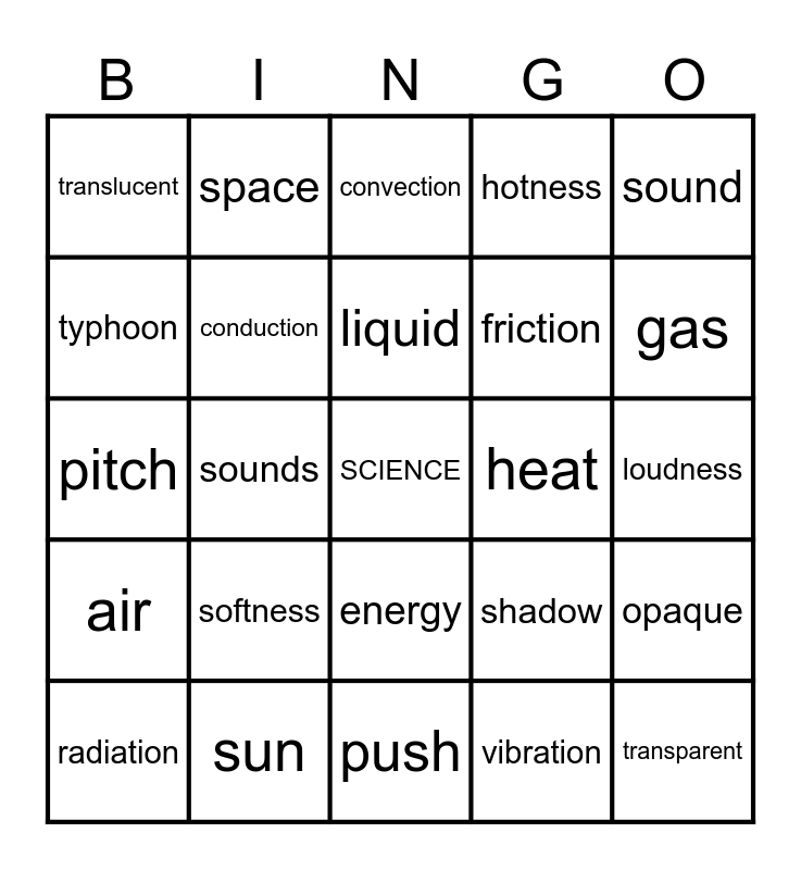 This bingo card has a free space and 29 words: Light, sun, convection, waves, sound, translucent, conduction, liquid, heat, opaque, radiation, sounds, vibration, transparent, pitch, solid, push, shadow, gas, air, softness, pull, friction, loudness, typhoon, space, energy, hotness and coldness.