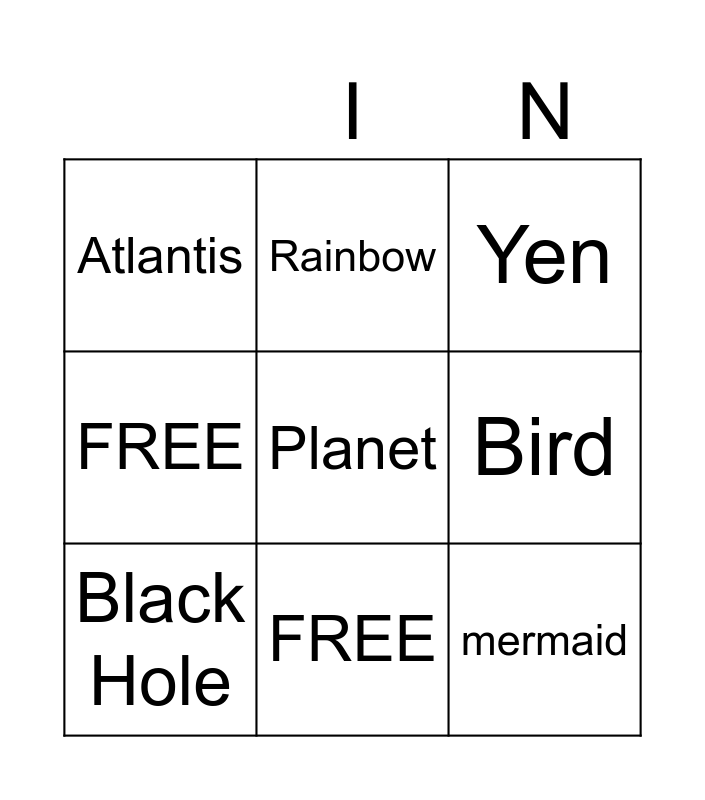 This bingo card has 9 words: Black Hole, Yen, Rainbow, FREE, Atlantis, Bird, Planet, mermaid and FREE.