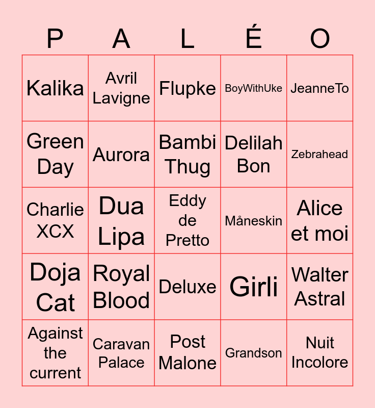 This bingo card has a free space and 24 words: Royal Blood, Caravan Palace, Bambi Thug, Against the current, JeanneTo, Kalika, Green Day, Avril Lavigne, Måneskin, Deluxe, Delilah Bon, Charlie XCX, Girli, Walter Astral, Aurora, Grandson, Alice et moi, Flupke, Zebrahead, Dua Lipa, Nuit Incolore, Doja Cat, BoyWithUke and Post Malone.