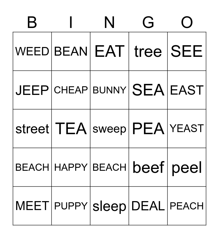 This bingo card has a free space and 24 words: HAPPY, PUPPY, BUNNY, MEET, SEE, WEED, JEEP, BEAN, PEA, BEACH, SEA, street, beef, peel, CHEAP, DEAL, YEAST, EAT, EAST, TEA, PEACH, BEACH, tree and sleep.