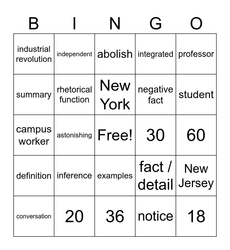 This bingo card has a free space and 29 words: conversation, lecture, astonishing, thriving, industrial revolution, abolish, rhetorical function, inference, 30, 20, 60, 18, 36, notice, student, reasons, examples, definition, professor, campus worker, fact / detail, NOT, negative fact, summary, integrated, independent, New Jersey, New York and 4.
