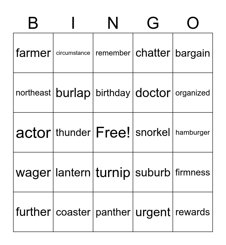 This bingo card has a free space and 24 words: lantern, coaster, birthday, further, bargain, farmer, northeast, circumstance, snorkel, turnip, doctor, actor, suburb, firmness, burlap, urgent, hamburger, remember, organized, thunder, rewards, wager, chatter and panther.