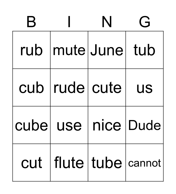 This bingo card has 20 words: Dude, over, June, rule, cut, cub, flute, rub, cube, mute, use, nice, rude, cannot, cute, doze, us, tub, tube and prune.