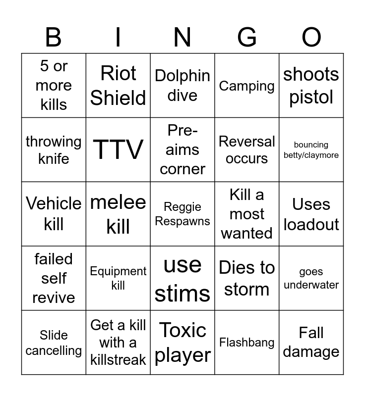This bingo card has a free space and 29 words: Slide cancelling, One-shot sniper kill, melee kill, Reggie Drinks, 5 or more kills, Dolphin dive, TTV, Equipment kill, Kill a most wanted, Get a kill with a killstreak, Uses loadout, Fall damage, Toxic player, Flashbang, bouncing betty/claymore, Explosion death, use stims, failed self revive, shoots pistol, Vehicle kill, Dies to storm, 30 seconds in death, Reversal occurs, throwing knife, Camping, Riot Shield, goes underwater, Pre-aims corner and aggressive rush.