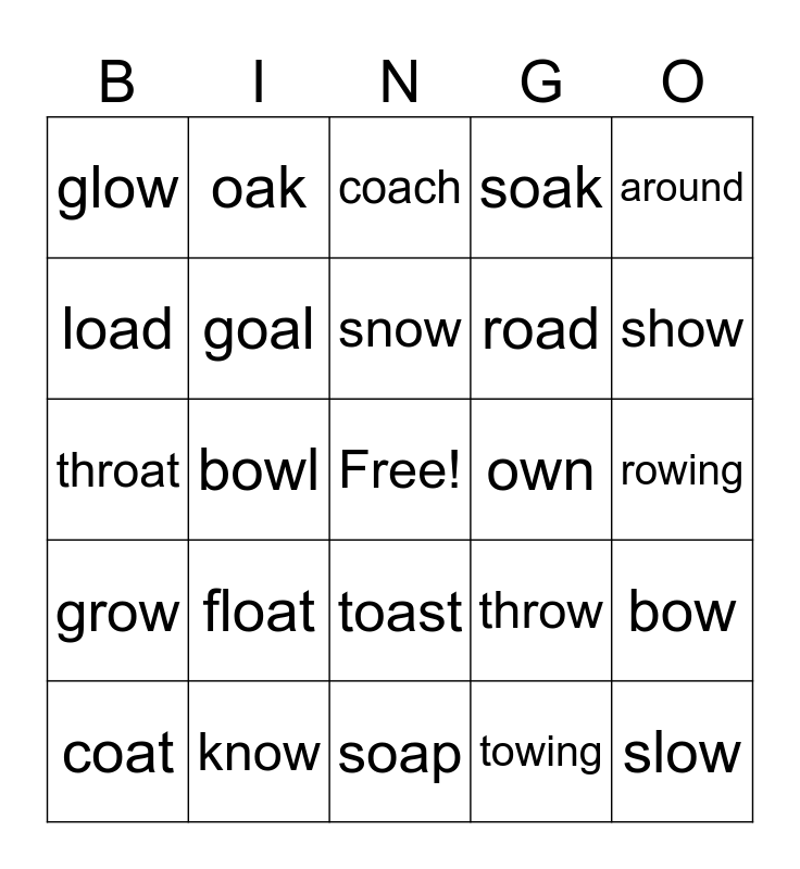 This bingo card has a free space and 29 words: coat, groan, bowl, goat, glow, coach, goal, float, own, know, rowing, slow, soap, towing, show, coast, toast, grow, around, throat, throw, moan, road, load, soak, oak, bow, snow and loaf.