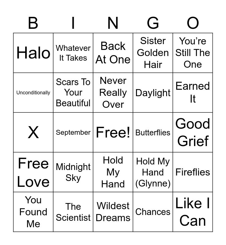 This bingo card has a free space and 178 words: Lucky, Bubbly, I Won’t Give Up, You All Over Me, Butterflies, Stay, Stay With Me, Best Of My Love, How Deep is Your Love, Time After Time, I’ll Make Love To You, You And Me, Back At One, Won’t Go Home Without You, Daylight, What A Feeling, The Scientist, I Can Feel You Breathe, Put Your Records On, Falling Slowly, I’ll Stand By You, Make You Mine, All My Life, I Love You Always Forever, Hold On, We’re Going Home, If I Ain’t Got You, Lay Me Down, Flowers In Your Hair, Sister Golden Hair, Ghost, She Will Be Loved, Angel Baby, Hello My Love, Crimson and Clover, Can’t Take My Eyes Off of You, Can’t Get Enough of Your Love, Someone You Loved, Kiss Me, Delicate, Everlasting Love, Halo, Your Song, Free Love, Just The Two Of Us, I Knew I Loved You, Mess Is Mine, So It Goes, Collide, Wonderful Tonight, Lovefool, Earned It, Someone To You, You’re Still The One, Dedicated To The One I Love, This Is Heaven, Just The Way You Are, Electric Love, Whatcha Say, Fire and the Flood, Rhythm of Love, Lay It All On Me, Whatever It Takes, Fireflies, X, Really Don’t Care, Wherever I Go, Need You Now, I Knew You Were Trouble, Turn The Car Around, Lean On, Traitor, Precious Love, Next To Me, Shadow of the Day, Best Day Of My Life, Unwritten, Part Of Me, Attention, Lights, Pompeii, Big Girls Don’t Cry, It’s Time, Love Story, The Middle, Stitches, Drivers License, Bad Habits, Send My Love, Crazy, All My Favorite Songs, Everybody, Scars To Your Beautiful, Falling In, No One, Prisoner, I Lived, All You Wanted, Someday, Running Up That Hill, Midnight Sky, Better In Time, Never Really Over, Good Grief, If I Lose Myself, Deja Vu, 1, 2, 3, 4, Memories, Wide Awake, Halfway Gone, If I Can’t Have You, Everywhere, Arms, Riptide, Break My Heart, Uncharted, Wildest Dreams, Irreplaceable, You Found Me, My Only Intentions, If I Was Your Hero, Out Of The Woods, September, Still Into You, As It Was, Your Body Is A Wonderland, Leavin’, Perfect, If You Only Knew, Rather Be, Breathe, Second Chance, Safe and Sound, Breakeven, Man Who Can’t Be Moved, The Show, Blank Space, Chandelier, Good 4 U, Not The Only One, Like I Can, Treat You Better, Happier, Hold My Hand, New Rules, Chances, Save Your Tears, Leave Before You Love Me, Sucker, No Surprise, Shut Up And Dance, Closer To Love, Home, These Days, Your Song Saved My Life, Butter, Give Your Heart A Break, Made You Look, Hold Me Closer, Cold Cold Heart, Shivers, Way You Move, No Surprise, Man Who Can’t Be Moved, Zero, Unconditionally, Castle on the Hill, Diamonds, Higher Love, Slow Hands, As It Was, She is Love, Hold My Hand (Glynne), Hold My Hand (Gaga), Come Back to Me, Pompeii, All I Ever Wanted, You’re An Ocean and We Don’t Have to Look Back Now.