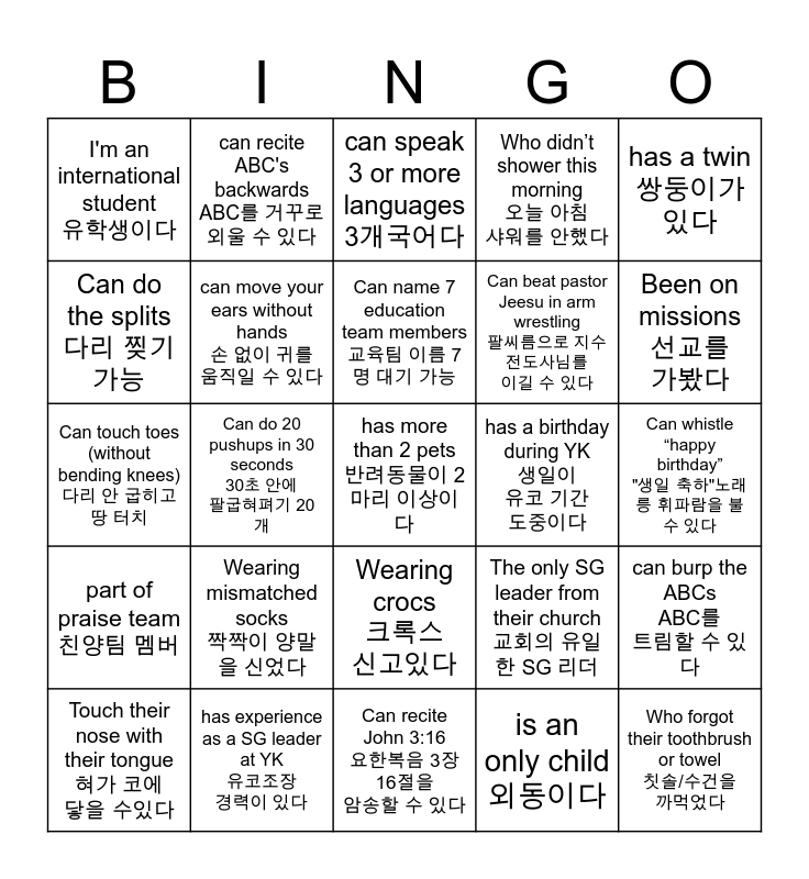 This bingo card has 25 words: part of praise team 친양팀 멤버, has experience as a SG leader at YK 유코조장 경력이 있다, has more than 2 pets 반려동물이 2마리 이상이다, is an only child 외동이다, has a twin 쌍둥이가 있다, I'm an international student 유학생이다, can recite ABC's backwards ABC를 거꾸로 외울 수 있다, can speak 3 or more languages 3개국어다, has a birthday during YK 생일이 유코 기간 도중이다, can burp the ABCs ABC를 트림할 수 있다, Can do the splits 다리 찢기 가능, can move your ears without hands 손 없이 귀를 움직일 수 있다, Can recite John 3:16 요한복음 3장 16절을 암송할 수 있다, The only SG leader from their church 교회의 유일한 SG 리더, Been on missions 선교를 가봤다, Touch their nose with their tongue 혀가 코에 닿을 수있다, Can do 20 pushups in 30 seconds 30초 안에 팔굽혀펴기 20개, Can name 7 education team members 교육팀 이름 7명 대기 가능, Can beat pastor Jeesu in arm wrestling 팔씨름으로 지수 전도사님를 이길 수 있다, Can whistle “happy birthday” "생일 축하"노래릉 휘파람을 불 수 있다, Can touch toes (without bending knees) 다리 안 굽히고 땅 터치, Wearing mismatched socks 짝짝이 양말을 신었다, Wearing crocs 크록스 신고있다, Who didn’t shower this morning 오늘 아침 샤워를 안했다 and Who forgot their toothbrush or towel 칫솔/수건을 까먹었다.