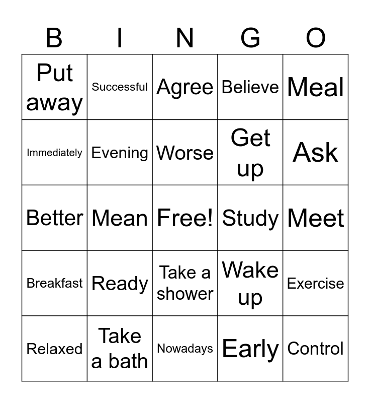 This bingo card has a free space and 24 words: Ready, Take a bath, Worse, Relaxed, Meal, Put away, Immediately, Successful, Study, Take a shower, Get up, Better, Wake up, Exercise, Evening, Early, Meet, Agree, Ask, Mean, Control, Breakfast, Believe and Nowadays.
