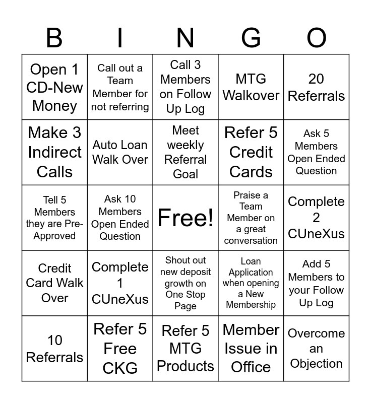 This bingo card has a free space and 24 words: Complete 1 CUneXus, Refer 5 Free CKG, Meet weekly Referral Goal, 10 Referrals, 20 Referrals, Open 1 CD-New Money, Make 3 Indirect Calls, Call out a Team Member for not referring, Praise a Team Member on a great conversation, Shout out new deposit growth on One Stop Page, Refer 5 Credit Cards, Tell 5 Members they are Pre-Approved, Loan Application when opening a New Membership, Add 5 Members to your Follow Up Log, Auto Loan Walk Over, Member Issue in Office, Complete 2 CUneXus, Call 3 Members on Follow Up Log, Ask 5 Members Open Ended Question, Ask 10 Members Open Ended Question, Overcome an Objection, Credit Card Walk Over, MTG Walkover and Refer 5 MTG Products.