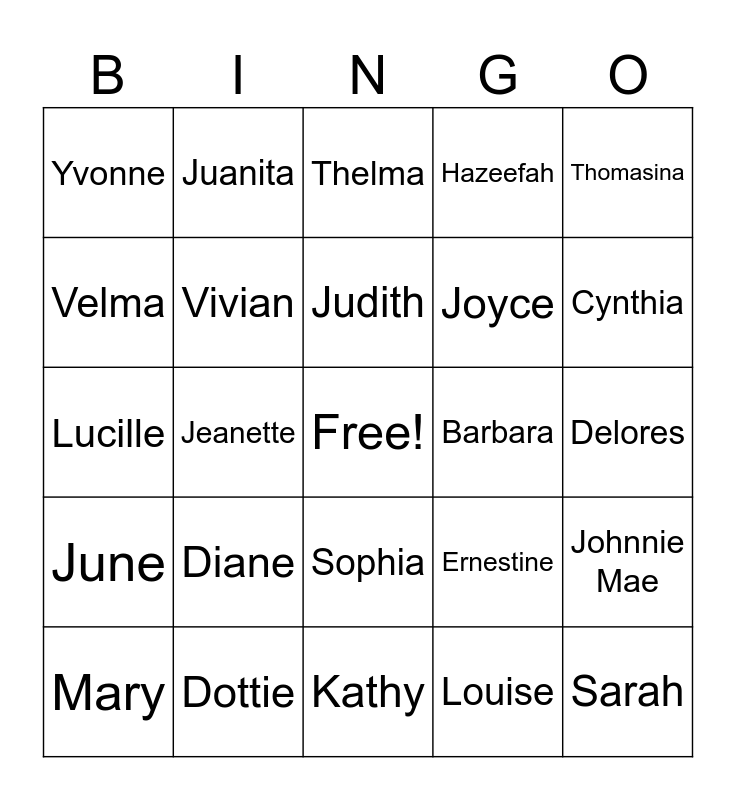 This bingo card has a free space and 24 words: Diane, Dottie, Judith, Mary, Thomasina, Yvonne, Velma, Juanita, Barbara, Sophia, Joyce, Lucille, Ernestine, Johnnie Mae, Vivian, Louise, Delores, Thelma, Cynthia, Jeanette, Sarah, June, Hazeefah and Kathy.