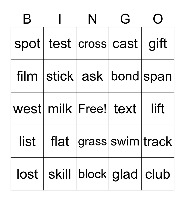 This bingo card has a free space and 24 words: flat, skill, ask, lost, gift, spot, film, test, text, grass, bond, west, swim, track, stick, glad, lift, cross, span, milk, club, list, cast and block.