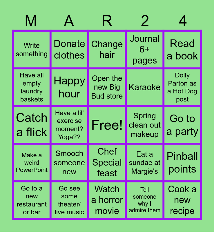 This bingo card has a free space and 24 words: Smooch someone new, Go see some theater/ live music, Open the new Big Bud store, Go to a new restaurant or bar, Read a book, Write something, Have all empty laundry baskets, Donate clothes, Spring clean out makeup, Chef Special feast, Karaoke, Catch a flick, Eat a sundae at Margie's, Pinball points, Happy hour, Tell someone why I admire them, Go to a party, Change hair, Dolly Parton as a Hot Dog post, Have a lil' exercise moment? Yoga??, Cook a new recipe, Make a weird PowerPoint, Journal 6+ pages and Watch a horror movie.