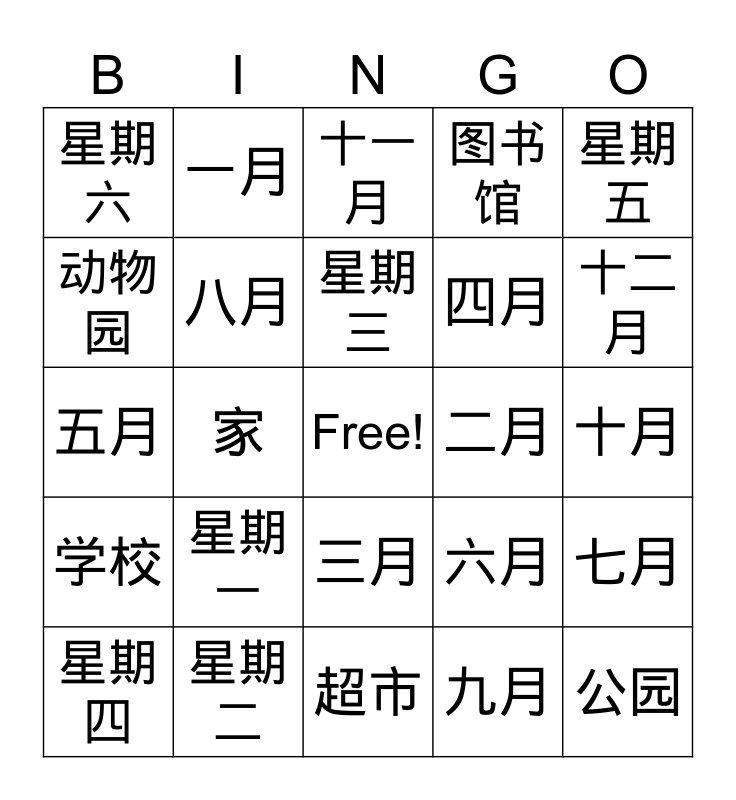 This bingo card has a free space and 24 words: 星期一, 星期二, 星期三, 星期四, 星期五, 星期六, 动物园, 一月, 二月, 三月, 四月, 五月, 六月, 七月, 八月, 九月, 十月, 十一月, 十二月, 家, 公园, 学校, 图书馆 and 超市.